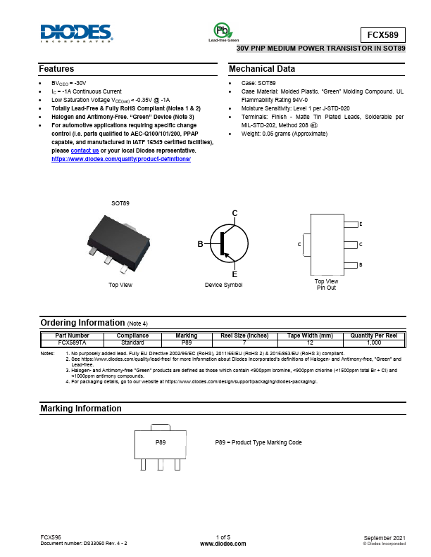 FCX589 30V PNP MEDIUM POWER TRANSISTOR IN SOT89.