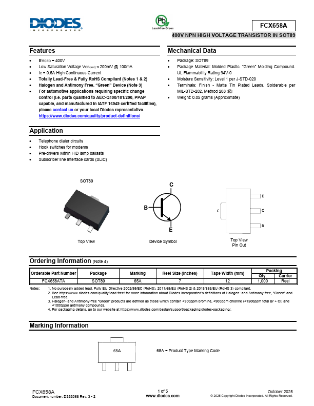 Overview: FCX658A 400V NPN HIGH VOLTAGE TRANSISTOR IN SOT89.