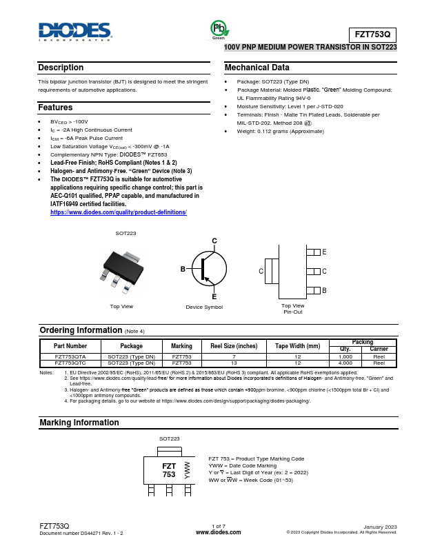 Overview: Green FZT753Q 100V PNP MEDIUM POWER TRANSISTOR IN SOT223.