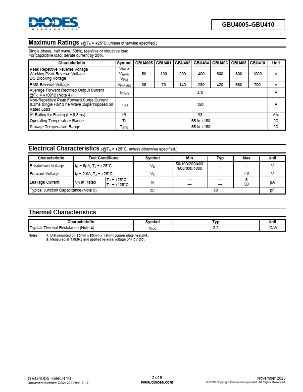 This datasheet PDF includes multiple part numbers: GBU408, GBU4005. Please refer to the document for exact specifications by model. |