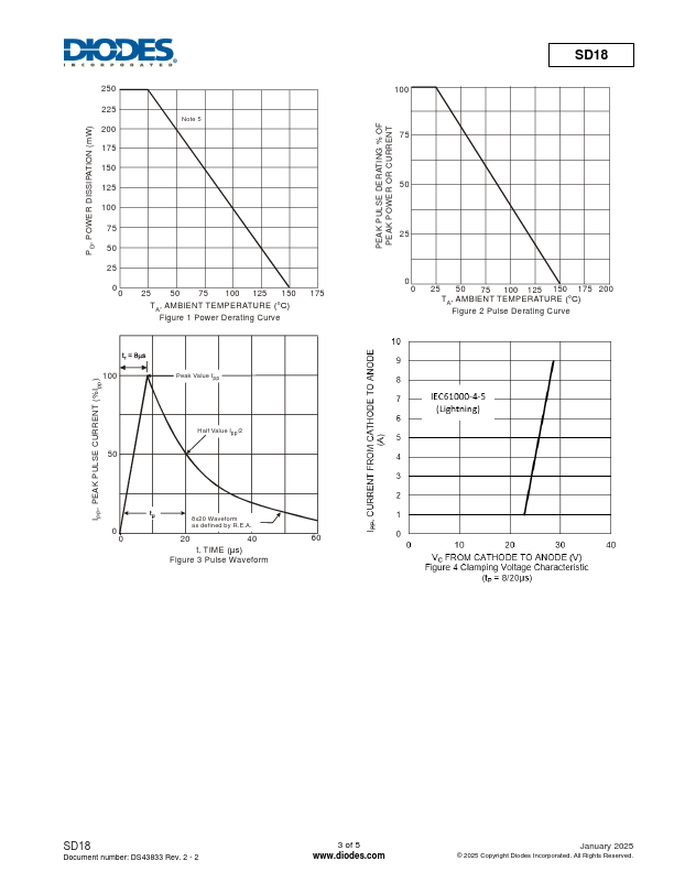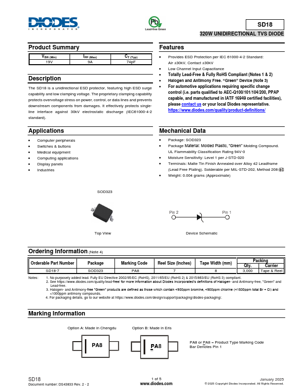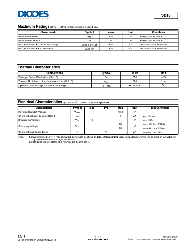 The SD18 is a unidirectional ESD protector, featuring high ESD surge capability and low clamping voltage. The proprietary clamping capability protects overvoltage stress on power, control, or data lines and prevents downstream ponents from damages. It effectively protects singleline interface against 30kV electrostatic discharge (IEC61000-4-2 standard).