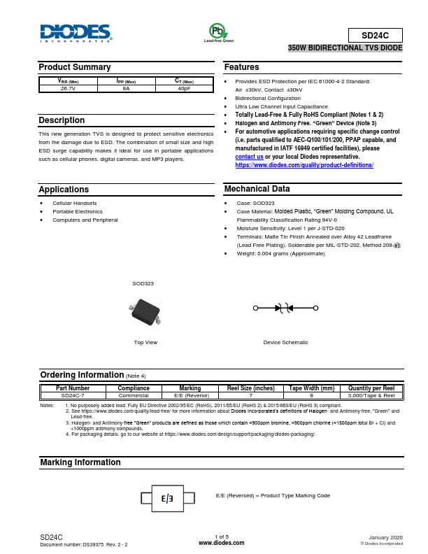This new generation TVS is designed to protect sensitive electronics from the damage due to ESD. The bination of small size and high ESD surge capability makes it ideal for use in portable applications such as cellular phones, digital cameras, and MP3 players.