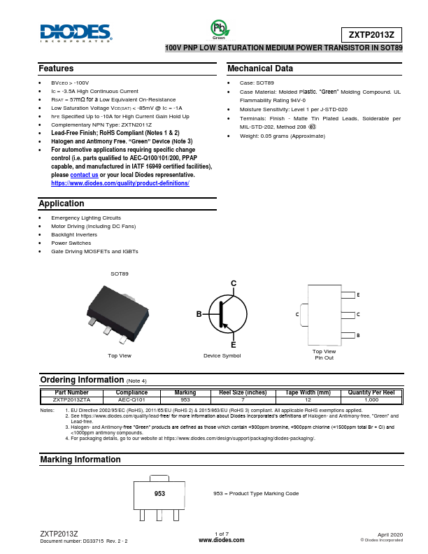 BVCEO > -100V IC = -3.5A High Continuous Current RSAT = 57mΩ for a Low Equivalent On-Resistance Low Saturation Voltage VCE(SAT) < -85mV @ IC = -1A hFE Specified Up to -10A for High Current Gain Hold Up Complementary NPN Type: ZXTN2011Z Lead-Free Finish; RoHS Compliant (Notes 1 & 2) Halogen and Antimony Free. “Green” Device (Note 3) For automotive applications requiring specific change