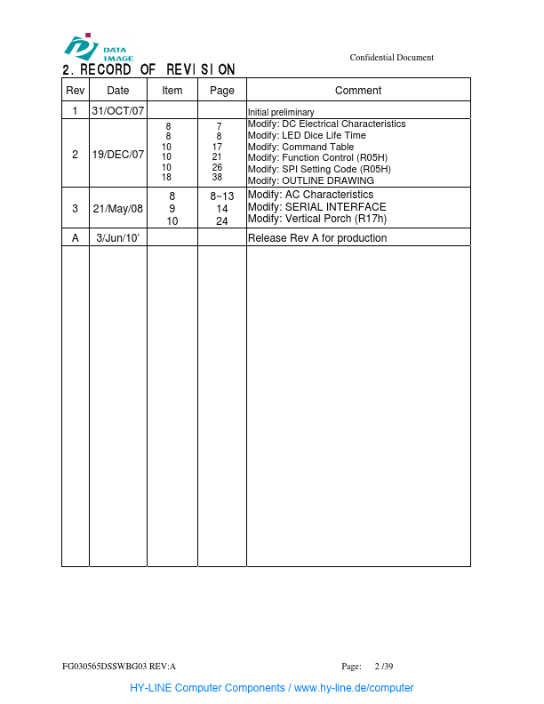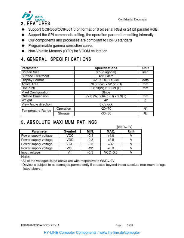 Confidential Document DATA IMAGE CORPORATION TFT Module Specification ITEM NO.: FG030565DSSWBG03 Table of Contents.