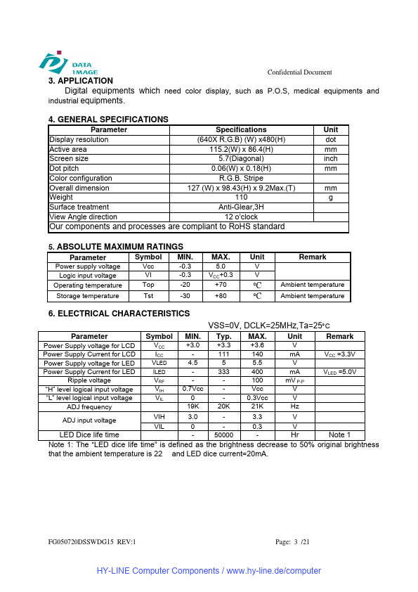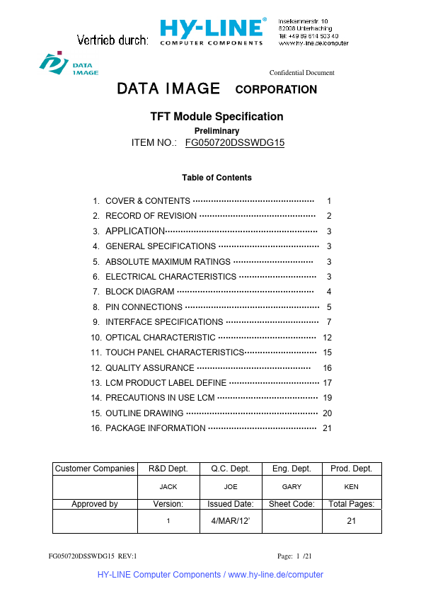 Confidential Document DATA IMAGE CORPORATION TFT Module Specification Preliminary ITEM NO.: FG050720DSSWDG15 Table of Contents 1. COVER & CONTENTS 1.