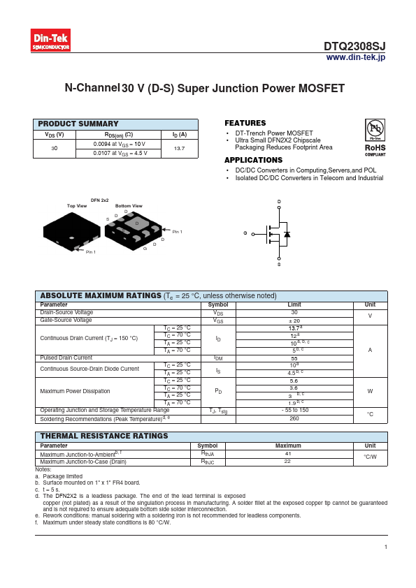 FEATURES • DT-Trench Power MOSFET • Ultra Small DFN2X2 Chipscale