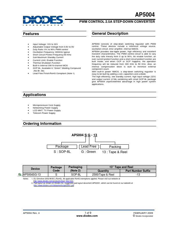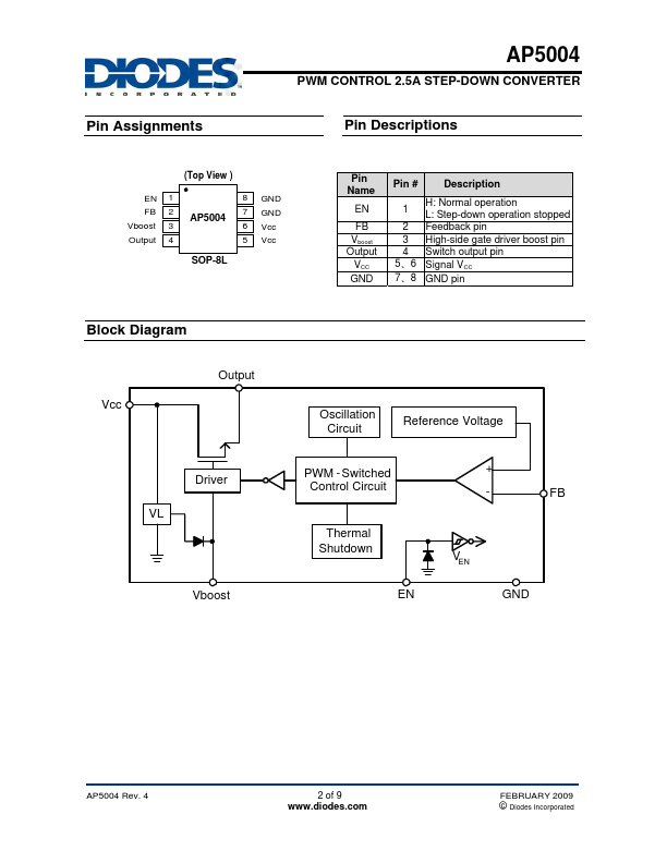 AP5004 consists of step-down switching regulator with PWM control. These devices include a reference voltage source, oscillation circuit, error amplifier, internal NMOS. AP5004 provides low-ripple power, high efficiency and excellent transient characteristics.