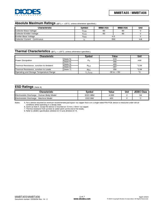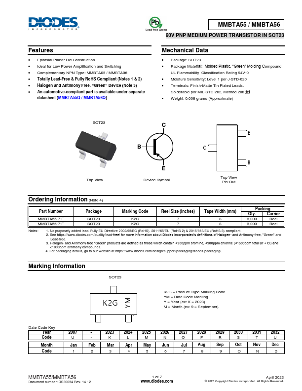 Features Epitaxial Planar Die Construction Ideal for Low Power Amplification and Switching plementary NPN Type: MMBTA05 / MMBTA06 Totally Lead-Free & Fully RoHS pliant (Notes 1 & 2) Halogen and Antimony Free. “Green” Device (Note 3) An automotive-pliant part is available under separate datasheet (MMBTA55Q / MMBTA56Q) MMBTA55 / MMBTA56 60V PNP MEDIUM POWER TRANSISTOR IN SOT23 Package:.