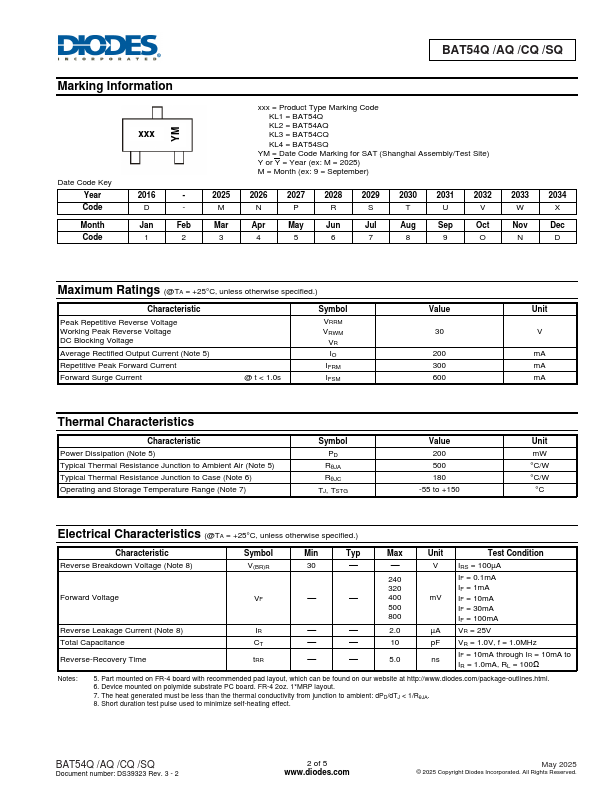 This datasheet PDF includes multiple part numbers: BAT54AQ, BAT54Q. Please refer to the document for exact specifications by model. |