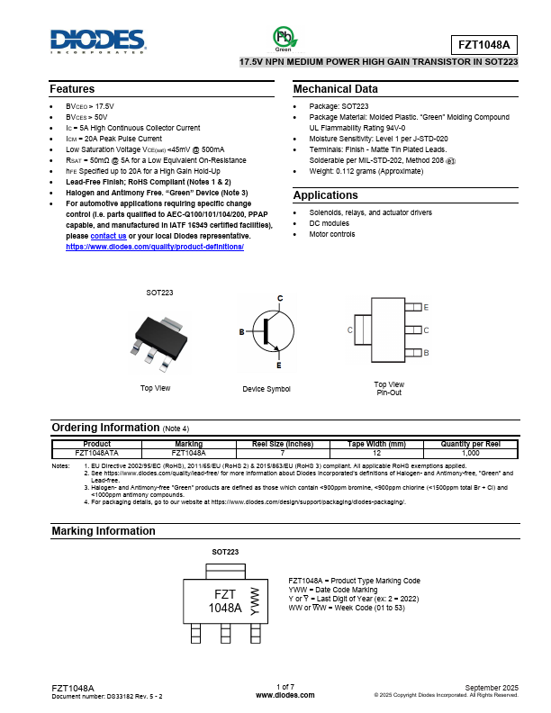 Green FZT1048A 17.5V NPN MEDIUM POWER HIGH GAIN TRANSISTOR IN SOT223.