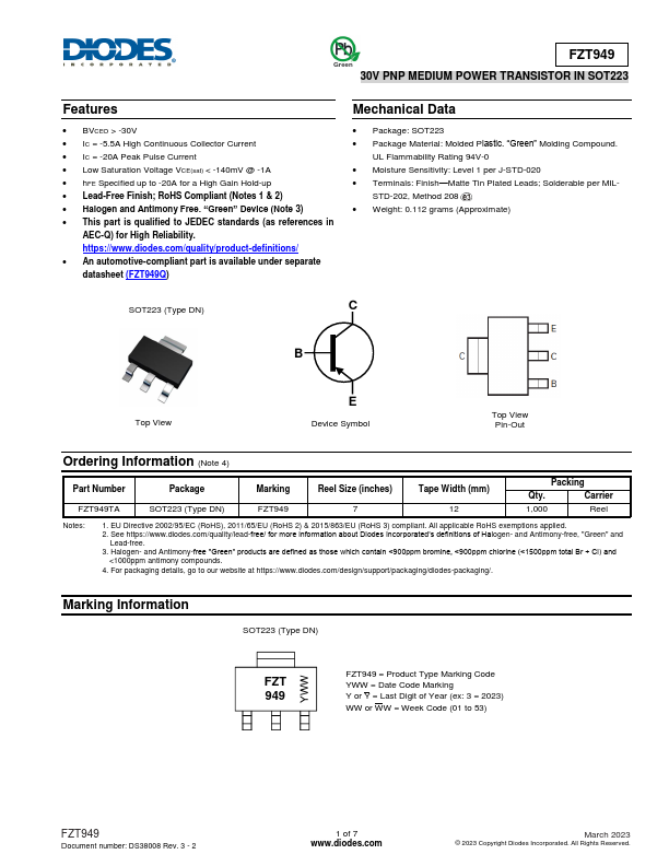 FZT949 Green 30V PNP MEDIUM POWER TRANSISTOR IN SOT223.