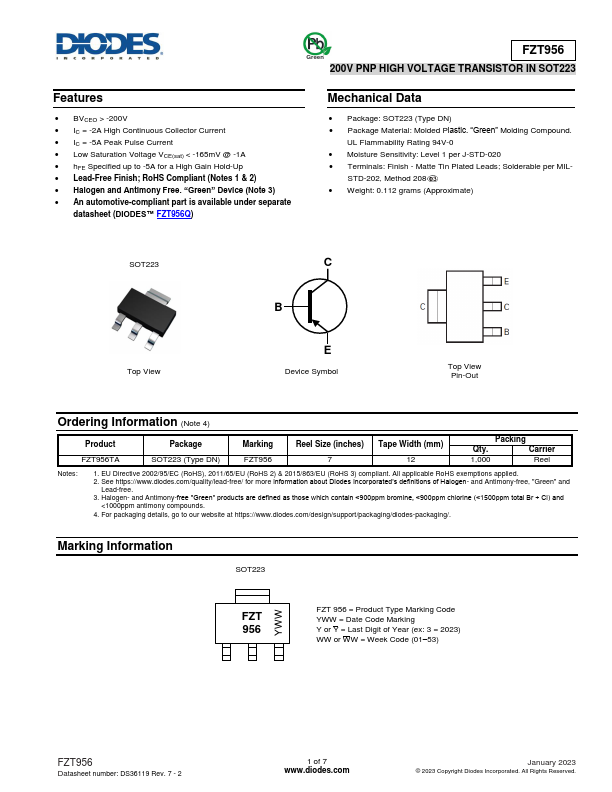 FZT956 Green 200V PNP HIGH VOLTAGE TRANSISTOR IN SOT223.