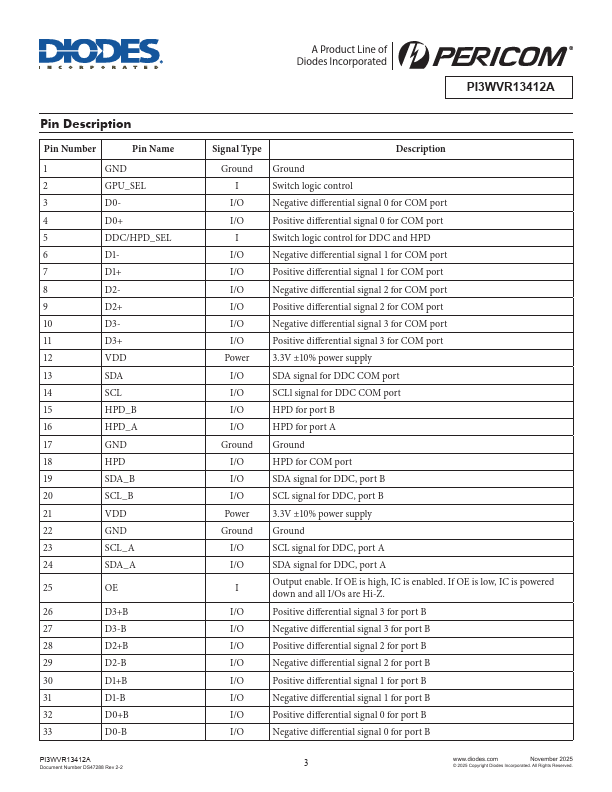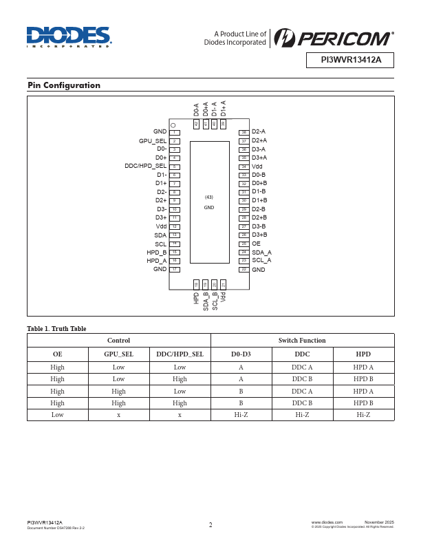 Features The PI3WVR13412A is a multi-standard video switch with wide voltage range capability. It supports HDMI 2.0 up to 4K2K@60Hz and emerging and proprietary standard. The PI3WVR13412A can pass high-speed signals up to 1.2V peak-to-peak differential with a mon-mode voltage from 0 to 3.4V for TMDS signal.
