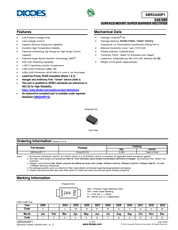 Green SBR2A40P1 2.0A SBR SURFACE-MOUNT SUPER BARRIER RECTIFIER.