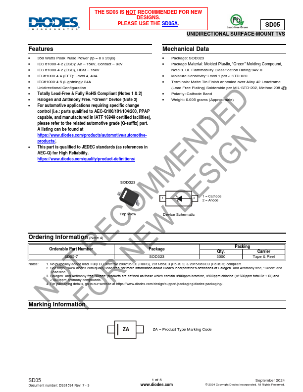 THE SD05 IS NOT REMENDED FOR NEW DESIGNS. SD05 UNIDIRECTIONAL SURFACE-MOUNT TVS.