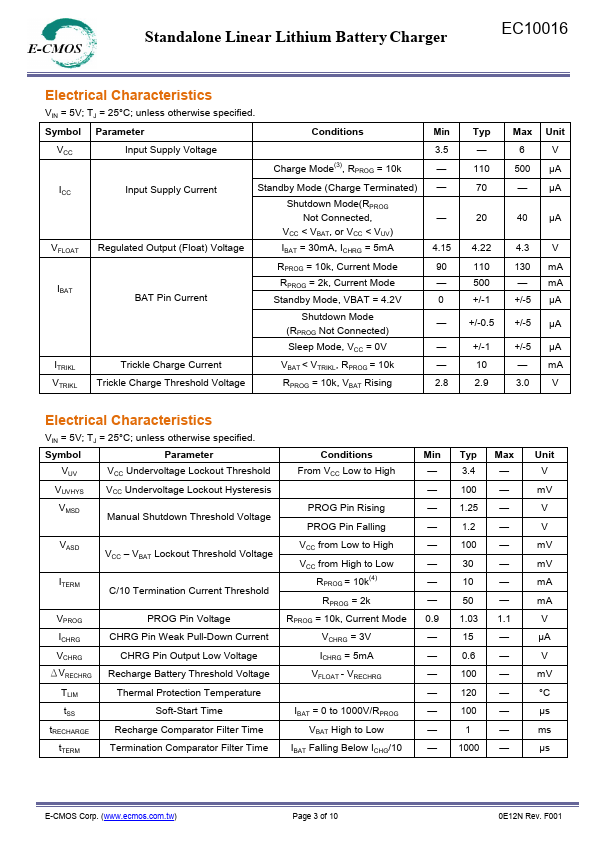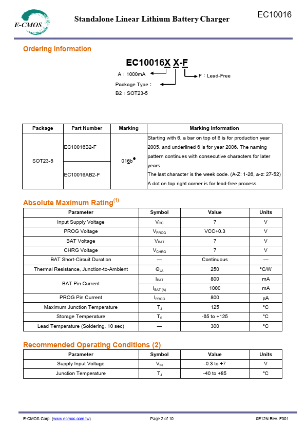 EC10016 is a plete constant-current & constant voltage linear charger for single cell lithium-ion and Lithium-polymer batteries. Its SOT-23 package and low external ponent count make EC10016 ideally suited for portable applications. Furthermore, the EC10016 is specifically designed to work within USB power specification.