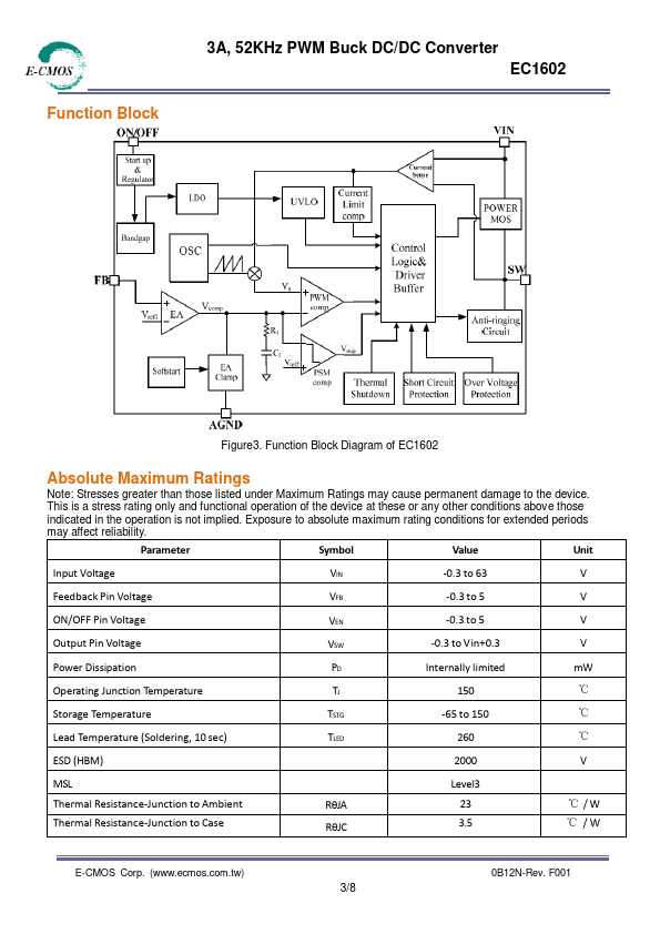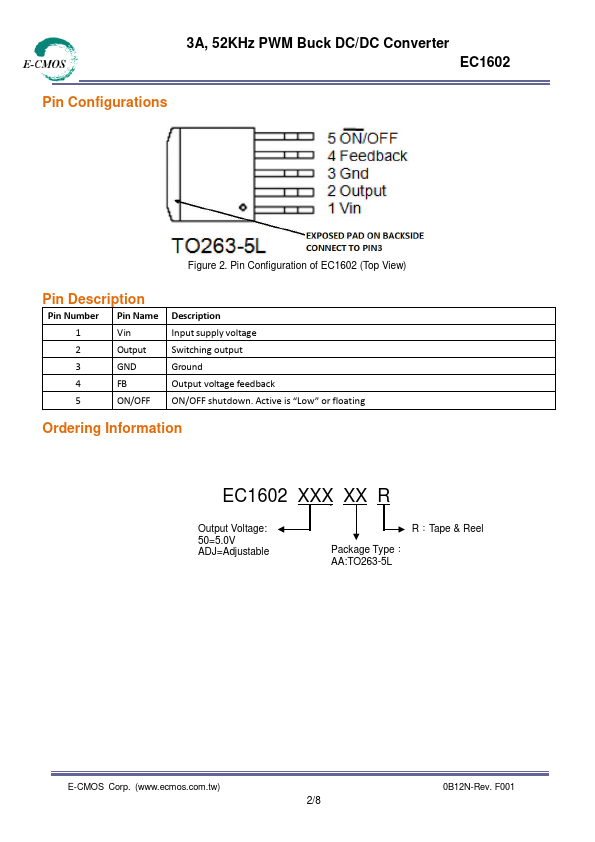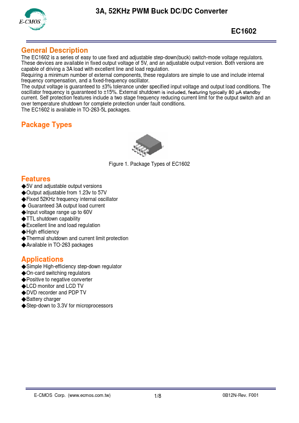 The EC1602 is a series of easy to use fixed and adjustable step-down(buck) switch-mode voltage regulators. These devices are available in fixed output voltage of 5V, and an adjustable output version. Both versions are capable of driving a 3A load with excellent line and load regulation.