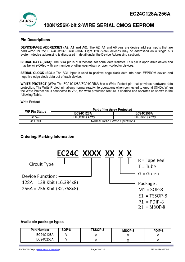 EC24C128A/256A 128K/256K-bit 2-WIRE SERIAL CMOS EEPROM General Description Features The EC24C128A/EC24C256A provides 131,072 /262,144 bits of serial electrically erasable and programmable read-only memory (EEPROM) organized as16,384/32,768 words of 8 bits each. The device is optimized for use in many industrial and commercial applications where low-power and low-voltage operation are essential. The EC24C128A/EC24C256A is available in space-saving PDIP-8,SOP-8, MSOP-8 and TSSOP-8 packages and is accessed via a twowire serial interface.  Wide Voltage Operation - VCC = 1.7V to 5.
