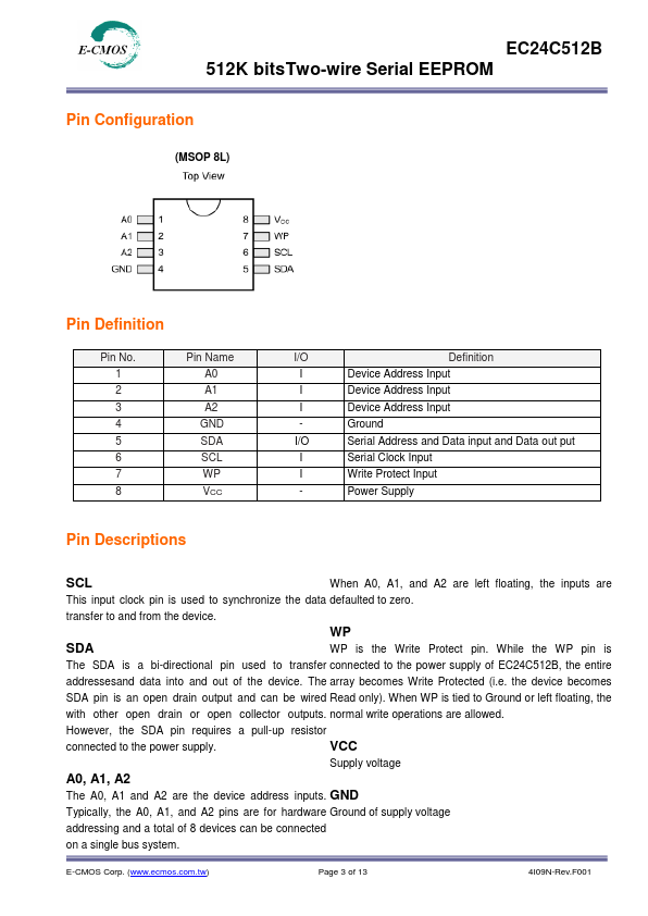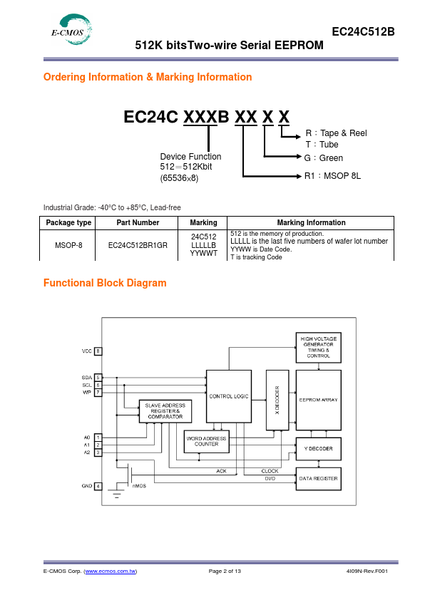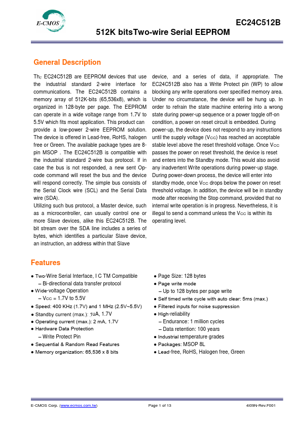 The EC24C512B are EEPROM devices that use the industrial standard 2-wire interface for munications. The EC24C512B contains a memory array of 512K-bits (65,536x8), which is organized in 128-byte per page. The EEPROM can operate in a wide voltage range from 1.7V to 5.5V which fits most application.