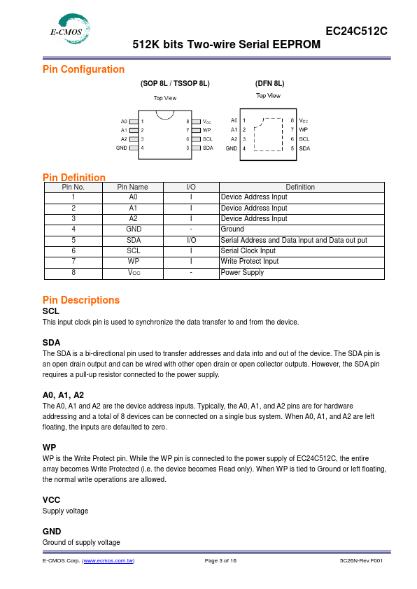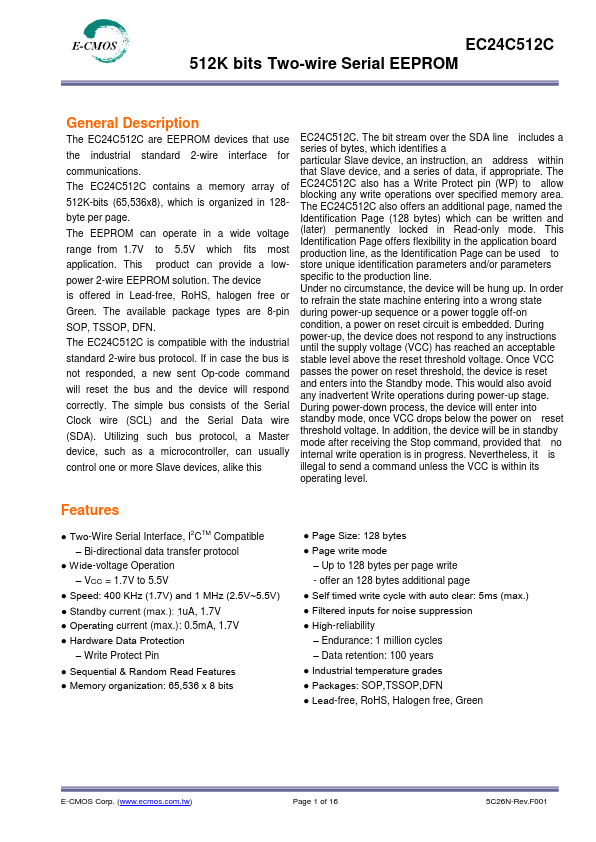 The EC24C512C are EEPROM devices that use the industrial standard 2-wire interface for munications. The EC24C512C contains a memory array of 512K-bits (65,536x8), which is organized in 128byte per page. The EEPROM can operate in a wide voltage range from 1.7V to 5.5V which fits most application.