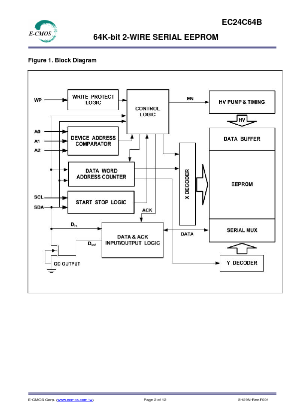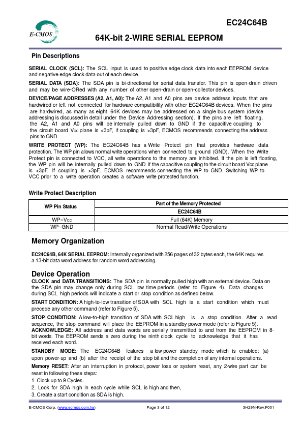 The EC24C64B provides 65,536 bits of serial electrically erasable and programmable readonly memory (EEPROM) organized as 8192 words of 8 bits each.