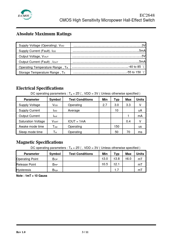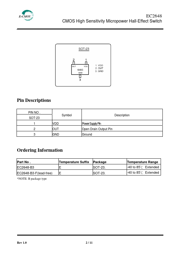 Combining chopper-stabilization techniques to provide accurate and stable magnetic switch points, the EC2648 Hall effect sensor IC is fabricated in CMOS technology. An internally controlled clocking mechanism, serving to place the high current-consuming portions of the circuit into a “power down” mode, is designed to cycle power to the Hall element and analog signal processing circuits. Periodically the device is “power on” by this internal logic and the magnetic flux from the Hall element is evaluated against the predefined thresholds. If the flux density is above or below the Bop/Brp thresholds, the output transistor is driven to change states accordingly.