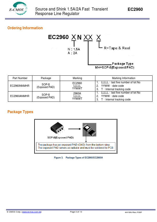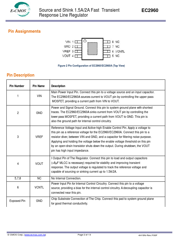 The EC2960/EC2960A linear regulator is designed to provide a regulated voltage with bi-direction output current for DDRSDRAM termination voltage. The EC2960 integrates two power transistors to source or sink load current up to 1.5A/2A.It also features internal soft-start, current-limit, thermal shutdown and enable control functions into a single chip.The internal soft-start controls the rising rate of the output voltage to prevent inrush current during start-up. The current-limit circuit detects the output current and limits the current during short-circuit or current overload conditions.