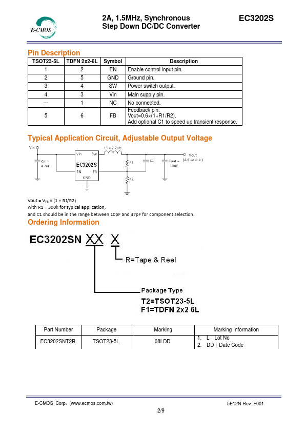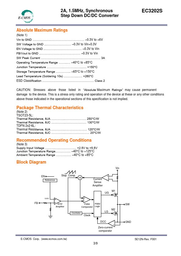 EC3202S is a high efficiency step down DC/DC converter operated with current mode and constant frequency. The internal switch and synchronous rectifier are integrated for high efficiency. External Schottky diodes are not required.