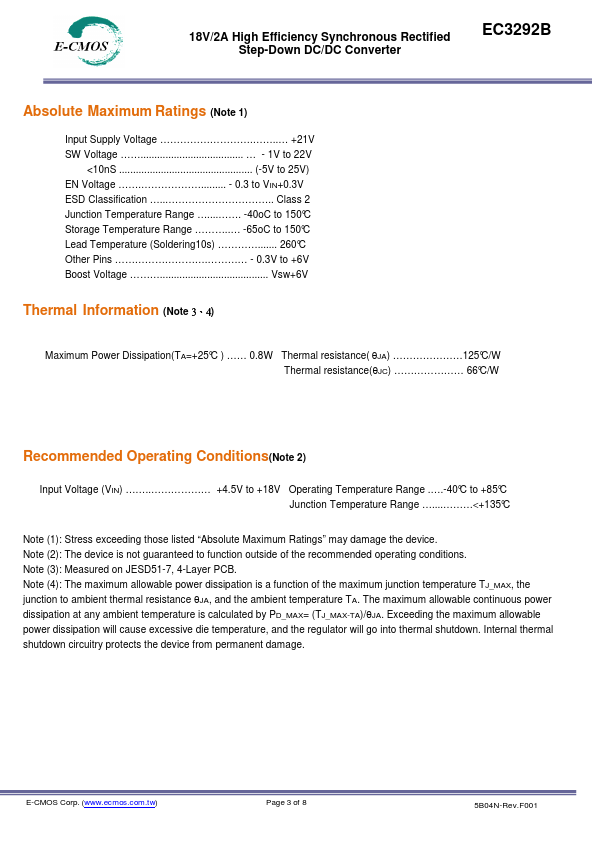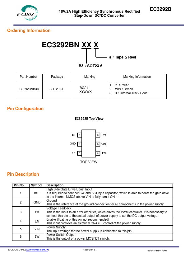 The EC3292B is a high efficiency synchronous step-down DC/DC converter series with 2A continuous output current supplied. Included on the substrate with the features listed is a high performance trans-conductance error amplifier that provides tight voltage regulation and accuracy under transient conditions. A built-in Under Voltage Lockout (UVLO) circuit is provided to prevent start-up until the input voltage reaches to 4.5V. In addition, it features overcurrent protection and thermal shutdown. To improve the light load efficiency, it is designed as the power saving mode (PSM) to minimize the switching loss by reducing the switching frequency.