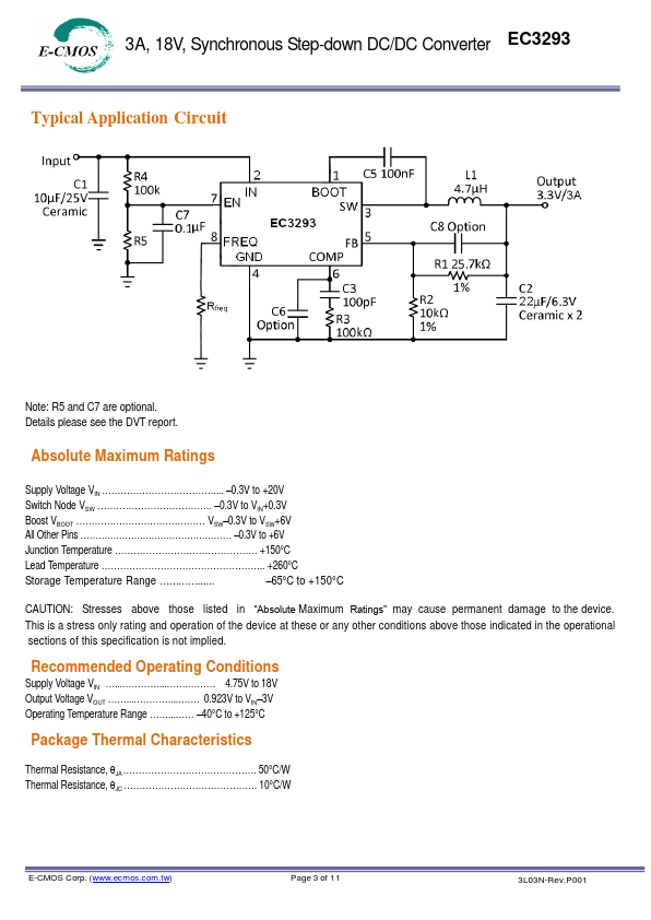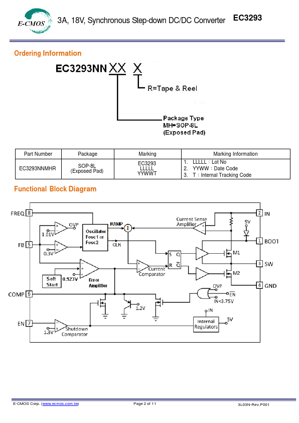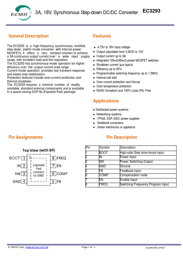 Features The EC3293 is a high-frequency, synchronous, rectified, step-down, switch-mode converter with internal power MOSFETs. It offers a very pact solution to achieve a 3A continuous output current over a wide input supply range, with excellent load and line regulation. The EC3293 has synchronous-mode operation for higher efficiency over the output current-load range.