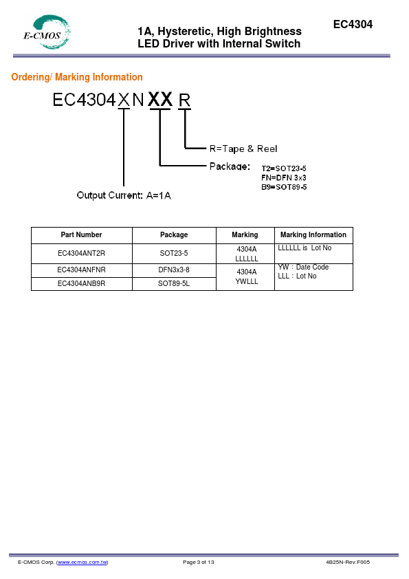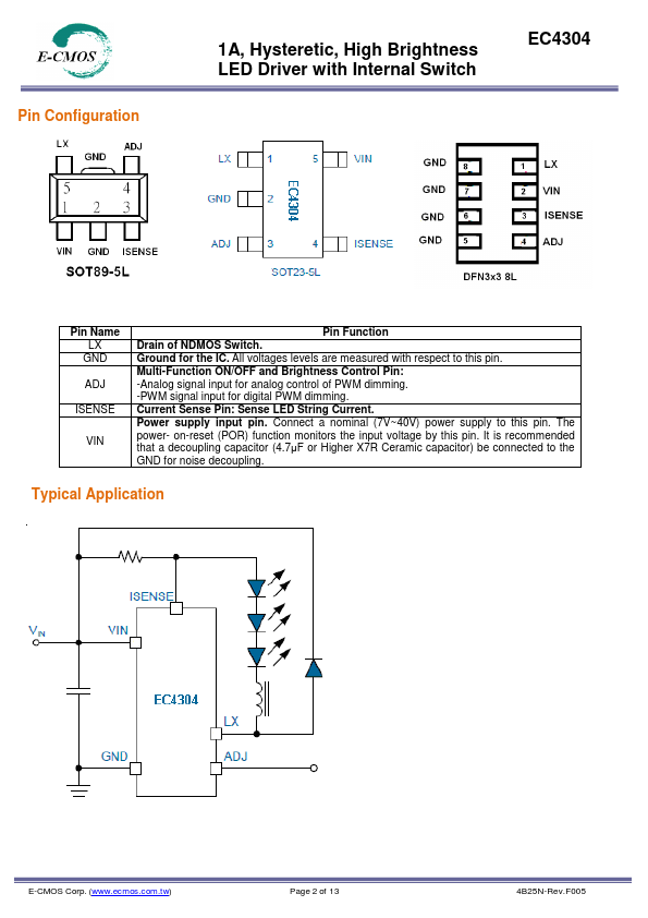 The EC4304 is a high-efficiency continuous mode inductive step-down converter which drives N-channel MOSFET and it is designed for driving single or multiple series connected LEDs from a voltage source higher than the LED voltage. It operates from input supply between 7V and 40V and provides and externally adjustable output current to 1A which is depending on supply voltage and external components. This EC4304 includes the output switch and high-side output current sensing circuit, which uses an external resistor to set the output current. The ADJ pin will accept either a DC voltage or a PWM waveform.