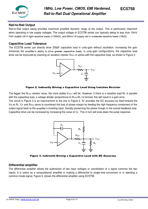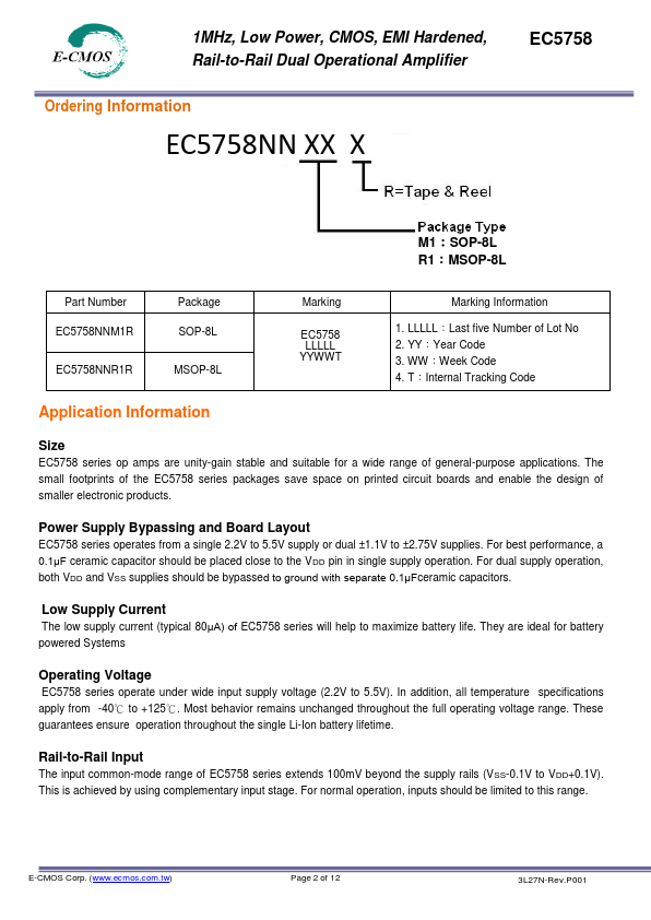Features The EC5758 is a single supply, low power CMOS dual operational amplifier; these amplifiers offer bandwidth of 1MHz, rail-to-rail inputs and outputs, and single-supply operation from 2.2V to 5.5V. The embedded anti-RF filter can significantly increase the RF immunity without extra ponents.