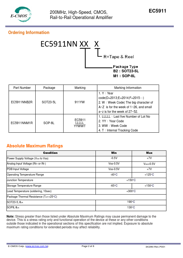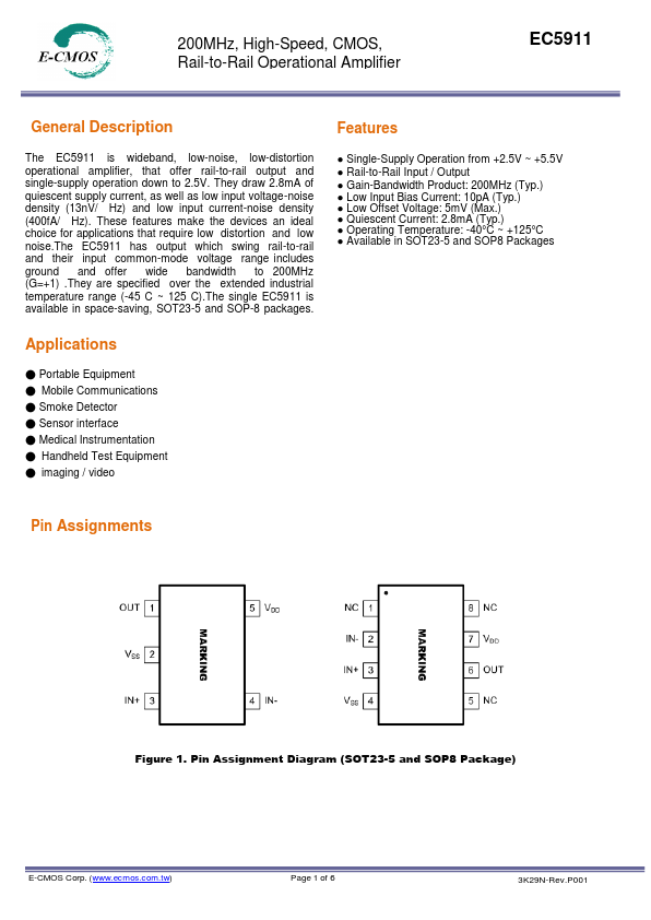 Features The EC5911 is wideband, low-noise, low-distortion operational amplifier, that offer rail-to-rail output and single-supply operation down to 2.5V. They draw 2.8mA of quiescent supply current, as well as low input voltage-noise density (13nV/ Hz) and low input current-noise density (400fA/ Hz). These features make the devices an ideal choice for applications that require low distortion and low noise.The...