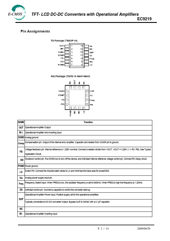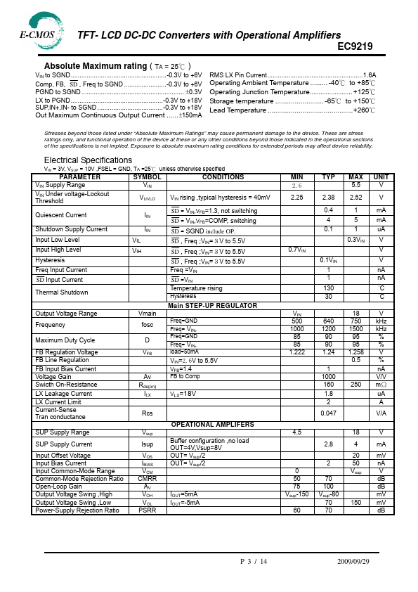 The EC9219 include a high-performance step-up regulator, and high-current operational amplifiers for active-matrix thin-film transistor (TFT) liquid-crystal displays (LCDs).