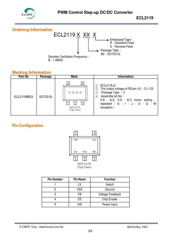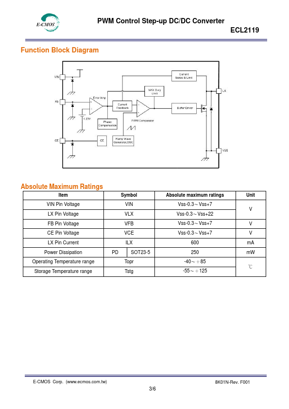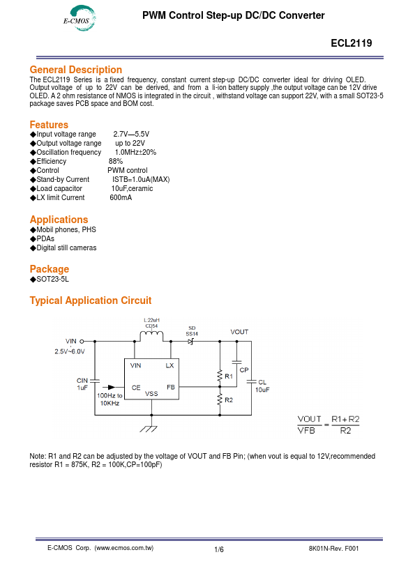 The ECL2119 Series is a fixed frequency, constant current step-up DC/DC converter ideal for driving OLED. Output voltage of up to 22V can be derived, and from a li-ion battery supply ,the output voltage can be 12V drive OLED. A 2 ohm resistance of NMOS is integrated in the circuit , withstand voltage can support 22V, with a small SOT23-5 package saves PCB space and BOM cost.