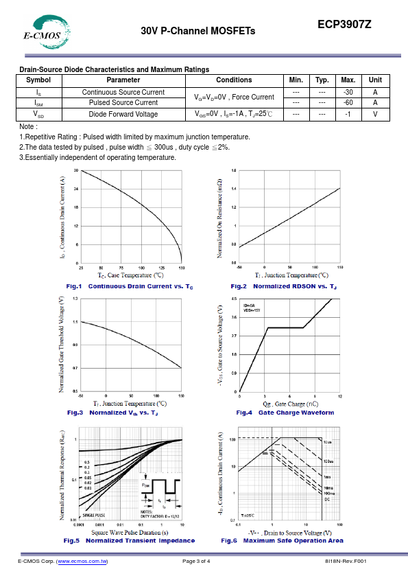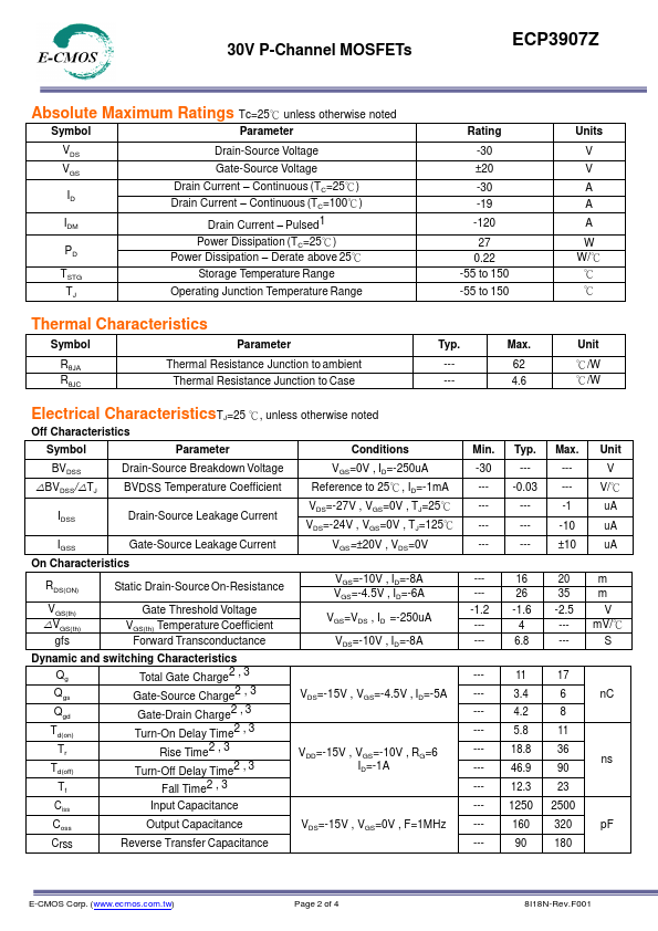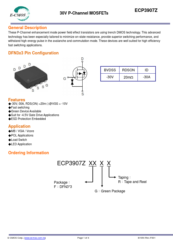 - 30V,-30A, RDS(ON) =20mΩ@VGS = -10V -Fast switching -Green Device Available -Suit for -4.5V Gate Drive