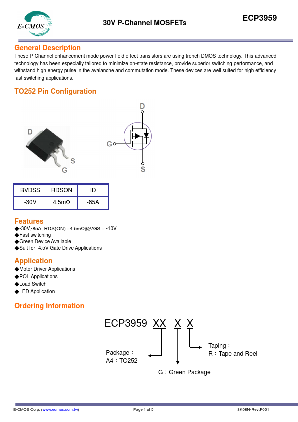 - 30V,-85A, RDS(ON) =4.5mΩ@VGS = -10V -Fast switching -Green Device Available -Suit for -4.5V Gate Drive
