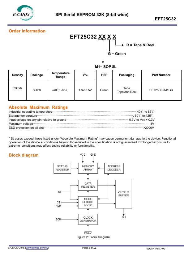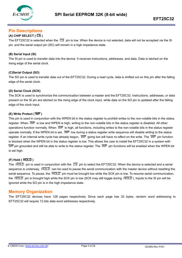 The EFT25C32 is 32768 bits of serial Electrical Erasable and Programmable Read Only Memory, commonly known as EEPROM.