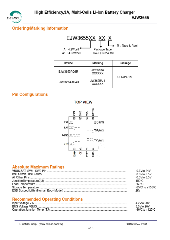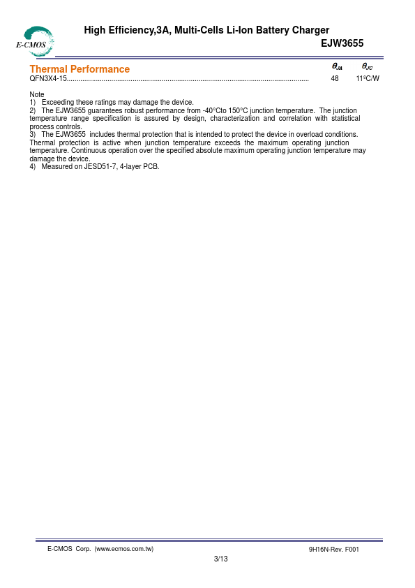 The EJW3655 supports 1 to 3 cells Li-ion battery, the full charge voltage and charge current can be programmed through external resistor.