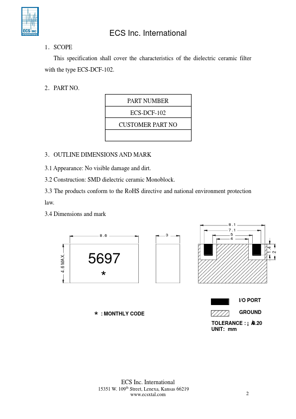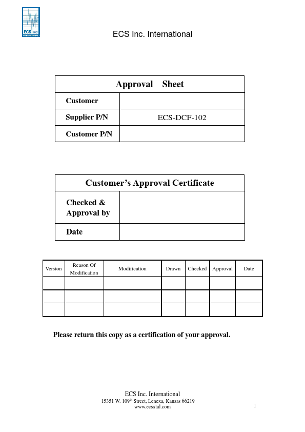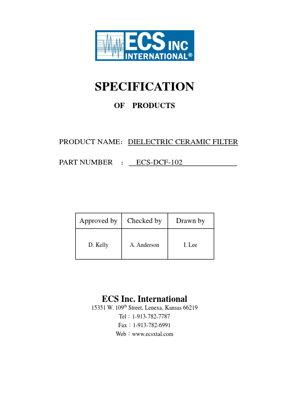 SPECIFICATION OF PRODUCTS PRODUCT NAME:DIELECTRIC CERAMIC FILTER PART NUMBER : ECS-DCF-102 Approved by Checked by Drawn by D. 109th Street, Lenexa, Kansas 66219 Tel:1-913-782-7787 Fax:1-913-782-6991 Web:.ecsxtal. International Approval Sheet Customer Supplier P/N ECS-DCF-102 Customer P/N Customer’s Approval Certificate Checked & Approval by Date Reason Of Version Modification Modification Drawn Checked Approval Date...