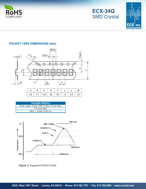 ECX-34Q SMD Crystal The ECX-34Q is a very compact SMD Tuning Fork Crystal with a 3.2 x 1.5 mm footprint. AEC-Q200 Qualified. Request a Sample ECX-34Q SMD CRYSTAL • RoHS Compliant • Low Power RTC Applications such as STM32 AN2867 • AEQ-Q200 Qualified • TS16949 certified production • PPAP supported DIMENSIONS (mm) OPERATING CONDITIONS / ELECTRICAL CHARACTERISTICS PARAMETERS Frequency Frequency Tolerance * Load Capacitance Drive Level Equivalent Series Resistance Turnover Temperature Temperature Coefficient Shunt Capacitance Motional Capacitance Aging (First Year) Operating Temperature * Storage Temperature CONDITIONS MIN Fo @ +25°C Specify in P/N DL ECX-34Q TYP MAX 32.768 ± 20 12.5 0.1 0.5 R1 70K CO C1 @ +25°C ±3°C S Option +20 -0.028 -40 -55 +25 -0.034 1.1 3.5 +30 -0.