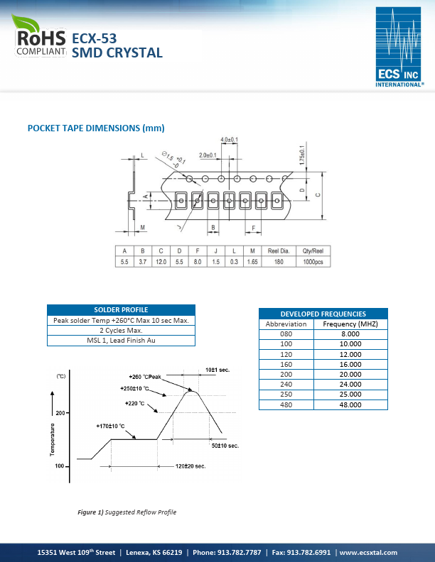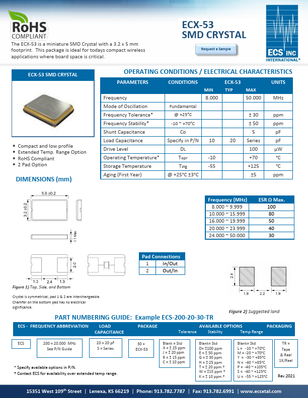 The ECX-53 is a miniature SMD Crystal with a 3.2 x 5 mm footprint. This package is ideal for todays pact wireless applications where board space is critical. ECX-53 SMD CRYSTAL Request a Sample ECX-53 SMD CRYSTAL pact and low profile Extended Temp.