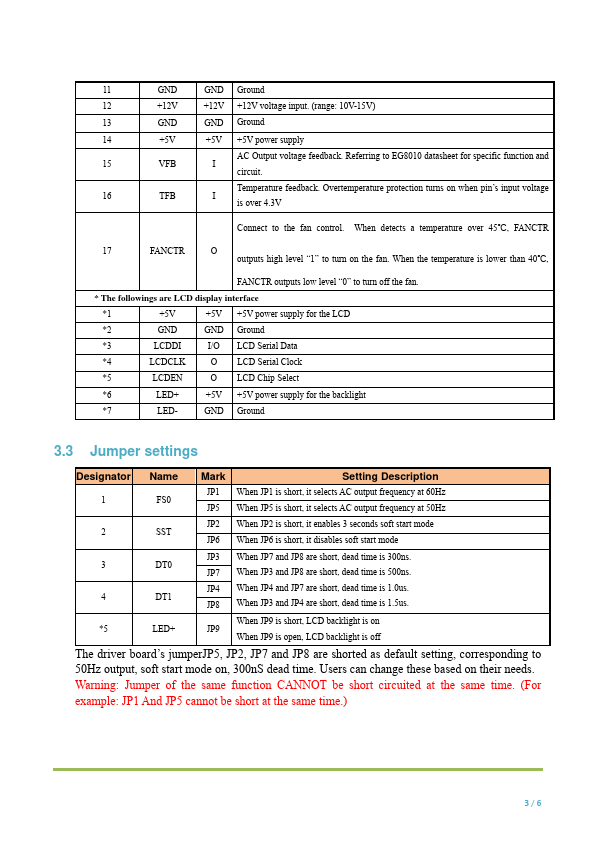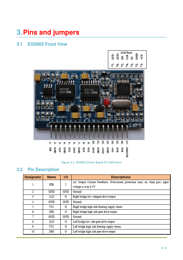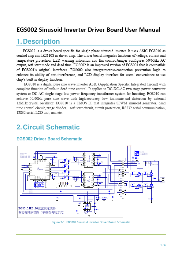 EGS002 is a driver board specific for single phase sinusoid inverter. It uses ASIC EG8010 as control chip and IR2110S as driver chip. The driver board integrates functions of voltage, current and temperature protection, LED warning indication and fan control.Jumper configures 50/60Hz AC output, soft start mode and dead time.