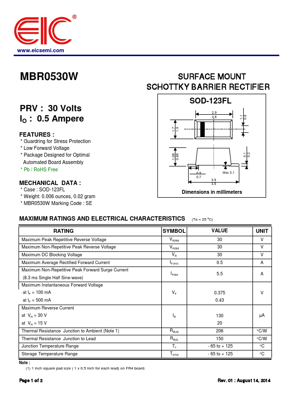 Overview: .eicsemi. MBR0530W PRV : 30 Volts IO : 0.5 Ampere.