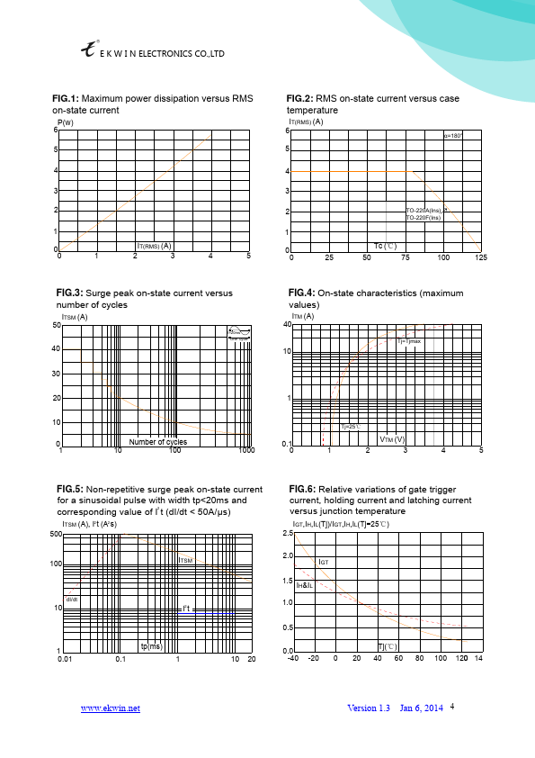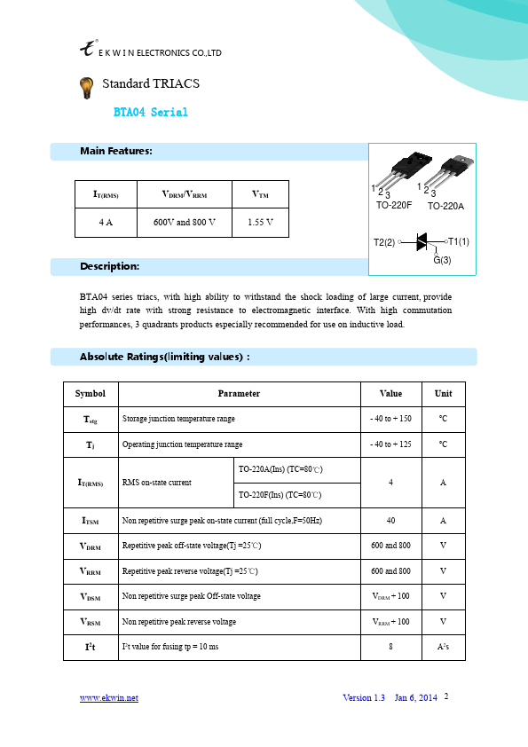 123 123 TO-220F TO-220A T2(2) T1(1) G(3) BTA04 series triacs, with high ability to withstand the shock loading of large current, provide high dv/dt rate with strong resistance to electromagnetic interface. With high mutation performances, 3 quadrants products especially remended for use on inductive load. Relative variations of gate trigger current, holding current and latching current versus.