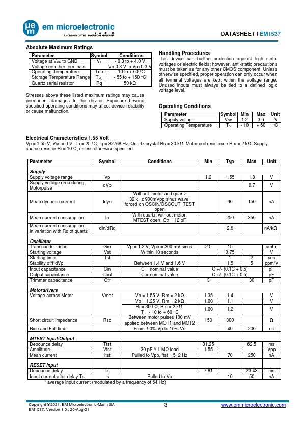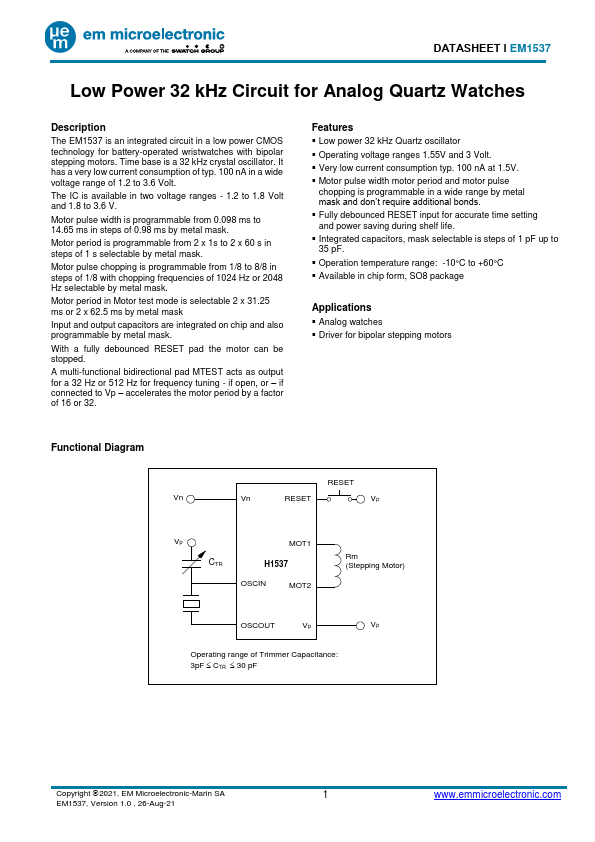 Overview: DATASHEET Ɩ EM1537 Low Power 32 kHz Circuit for Analog Quartz.