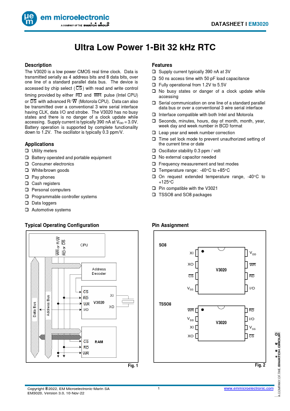 | EM3022 | Very Low Power 8-Bit 32 kHz RTC Module |