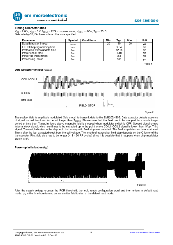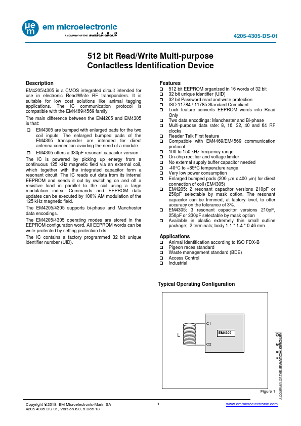 EM4205/4305 is a CMOS integrated circuit intended for use in electronic Read/Write RF transponders.