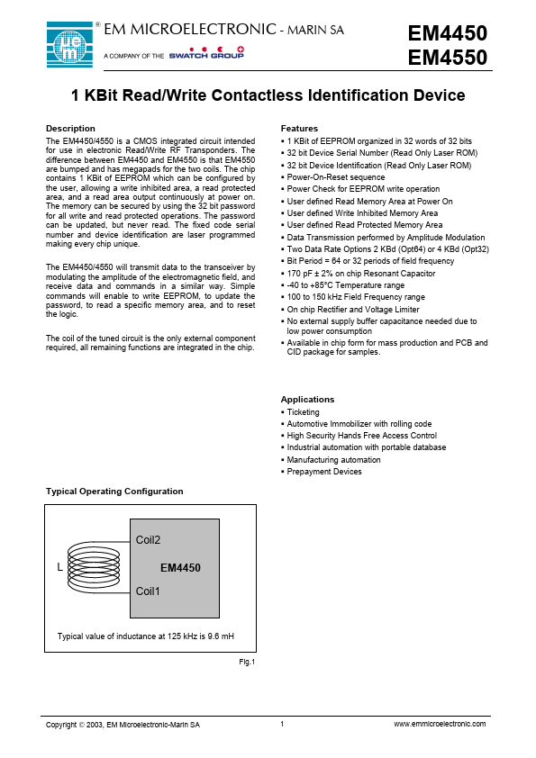 Overview: EM MICROELECTRONIC - MARIN SA EM4450 EM4550 1 KBit Read/Write Contactless Identification.