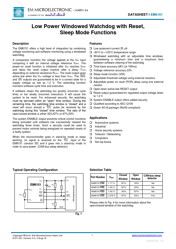 The EM6151 offers a high level of integration by combining voltage monitoring and software monitoring using a windowed watchdog.